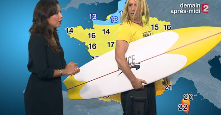Le surfer originaire de Nice incarné par Jean-Dujardin, vient de faire un jolie coup de pub pour la sortie de son film prévu pour ce mercredi 19 octobre dans les salles. C’est dans l’un des derniers bulletin météo de France 2 que l’acteur reprenant le rôle de son personnage phare est apparu pendant quelques secondes à l’image, passant comme-ci de rien n’était devant la présentatrice.