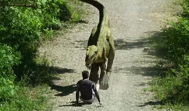 Bien entendu cette nouvelle caméra cachée avait pour but de piéger un passant et c’est plutôt réussi. Alors qu’un joggeur passe dans les environs pour sa course matinale, ce dernier tombe dans le piège lorsque Rémi qui sort de nul part et poursuivi par un gigantesque dinosaure ne peut qu’effrayer l’homme qui complètement paniquer se met à courir avant de sauter dans un canal juste à côté du sentier.
